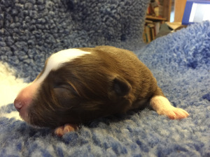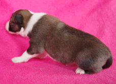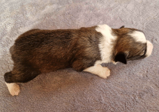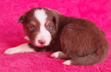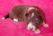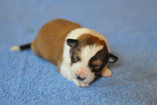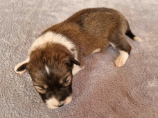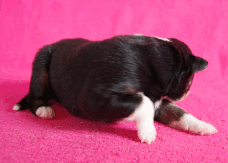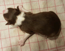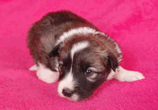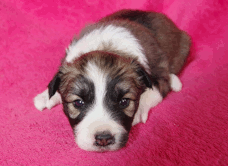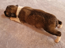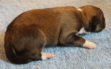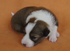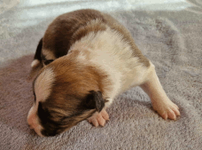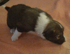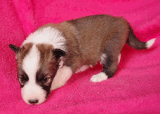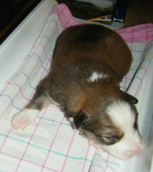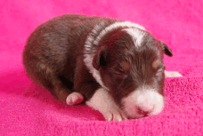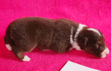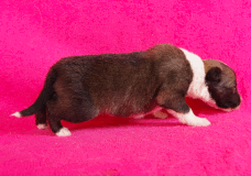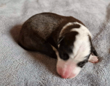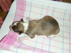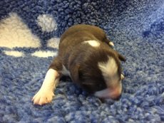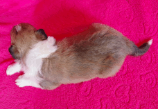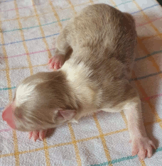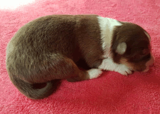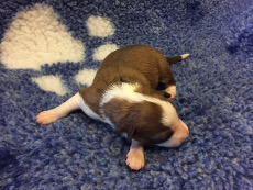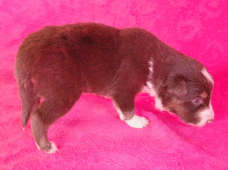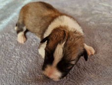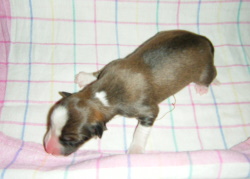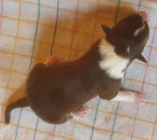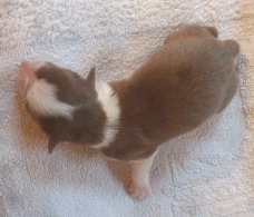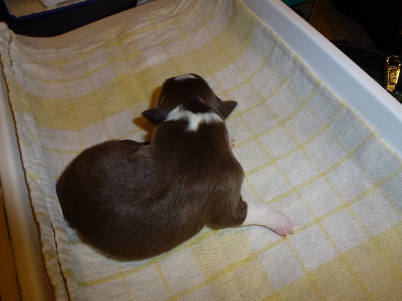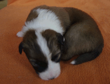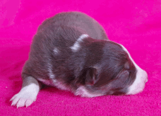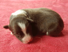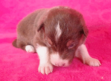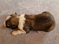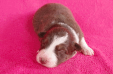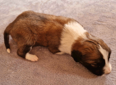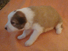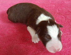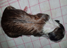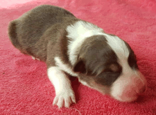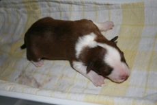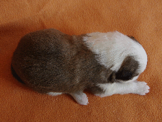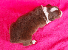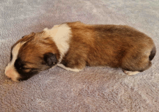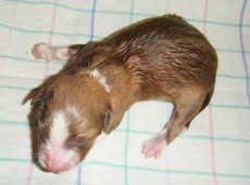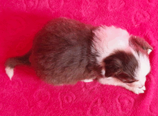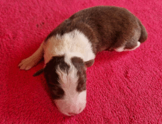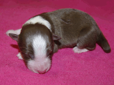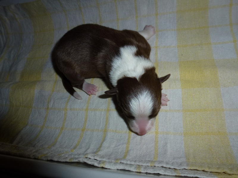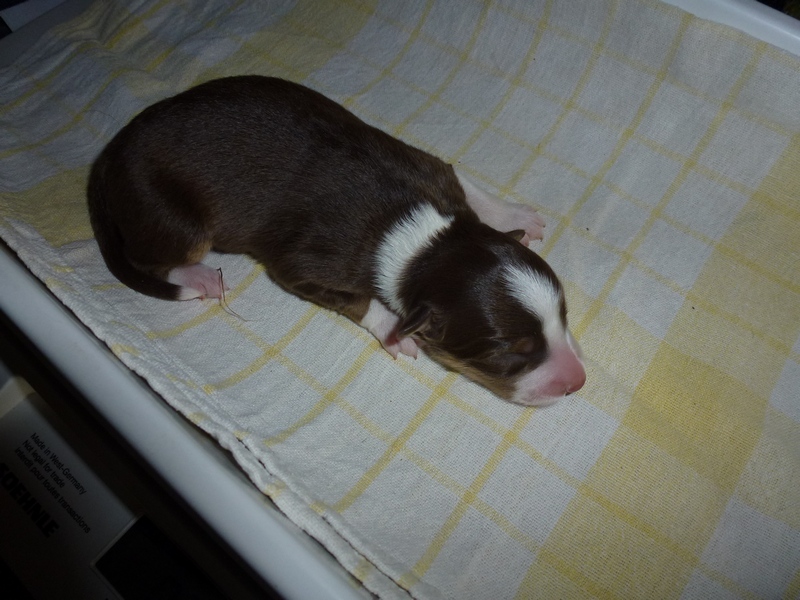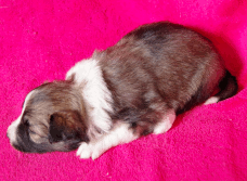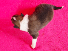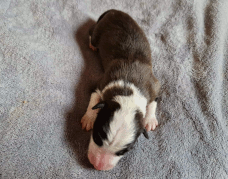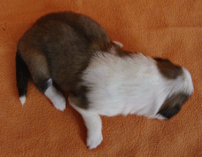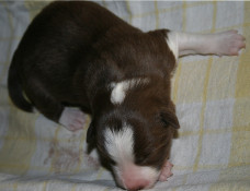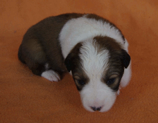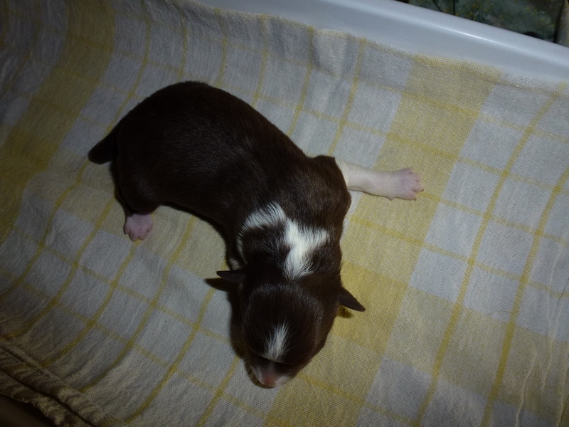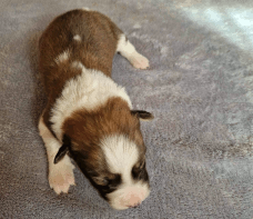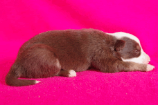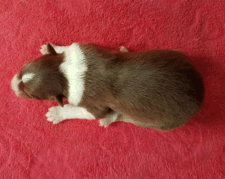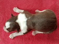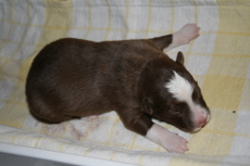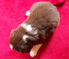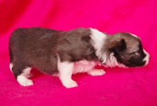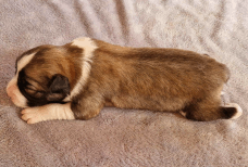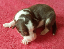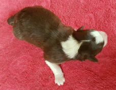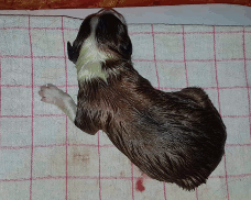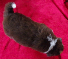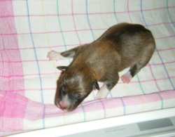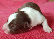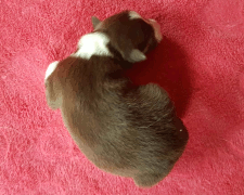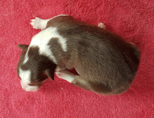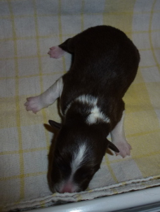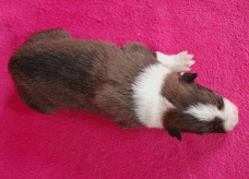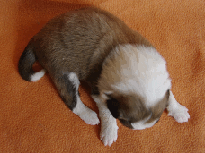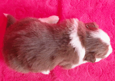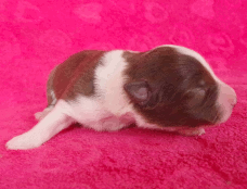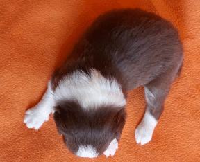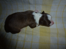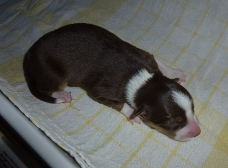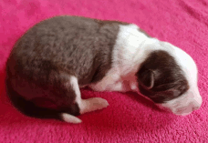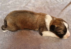| Skye - Hündin, 270 gr, braun weiß, linke Schulter weiß, geboren um 13:49 Uhr. |
