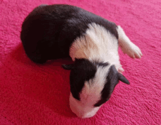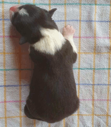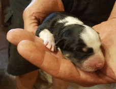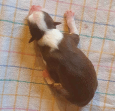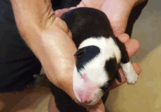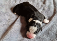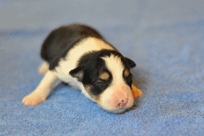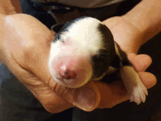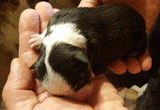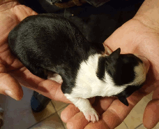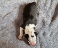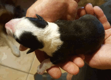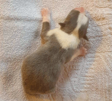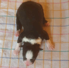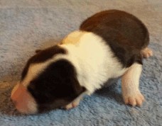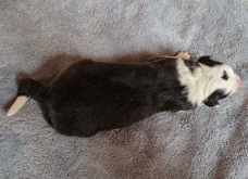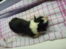 | Shane - Rüde, 310 gr, schwarz-weiß, Fleck auf dem Kopf, gleichmäßig gezeichnet, kam um 11:40 Uhr zur Welt. |